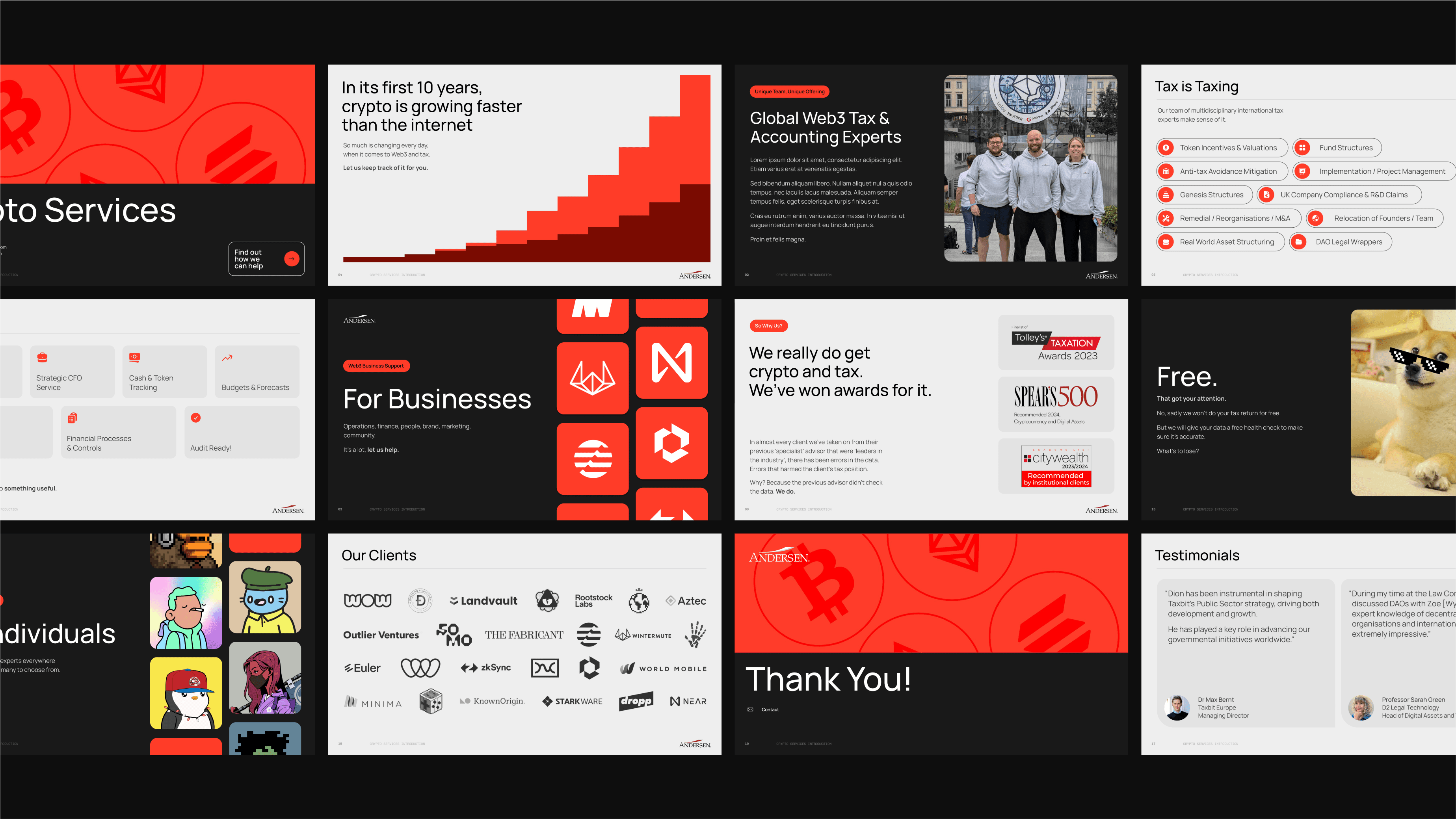 To support client presentations, we designed a bespoke services deck. The deck showcased Andersen’s diverse tax services in a visually organized, professional format, effectively communicating their expertise.
